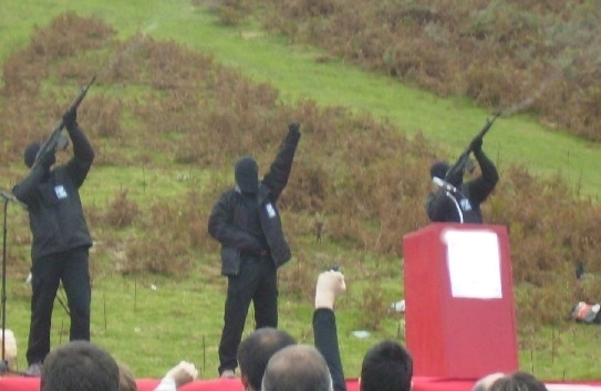 esta fiesta. La autodenominada “izquierda abertzale” ha vampirizado una tradición local para transformarla en un emblema nacionalista que ayuda a que los vascos se sientan especiales: únicos en el universo mundo y, por consiguiente, muy distintos a sus vecinos «españoles», que carecen de una costumbre ancestral como aquella. Por supuesto, los ultranacionalistas nunca son respetuosos con la tradición en sí, por lo que la han modificado a su gusto. Los Joaldunak actuales ya no aparecen solo en enero, como antes, sino siempre que la causa los necesita como propaganda patriótica. Así, no es raro ver sus figuras en carteles, partidos de fútbol, manifestaciones pro amnistía o incluso en la conmemoración del “Gudari Eguna” de 2006, en la que se les pudo contemplar delante del escenario poco antes de que unos encapuchados leyeran un comunicado en nombre de ETA. Era una forma de unir, alegóricamente, el pasado ancestral de “Euskal Herria” y la lucha de los “gudaris de hoy”.