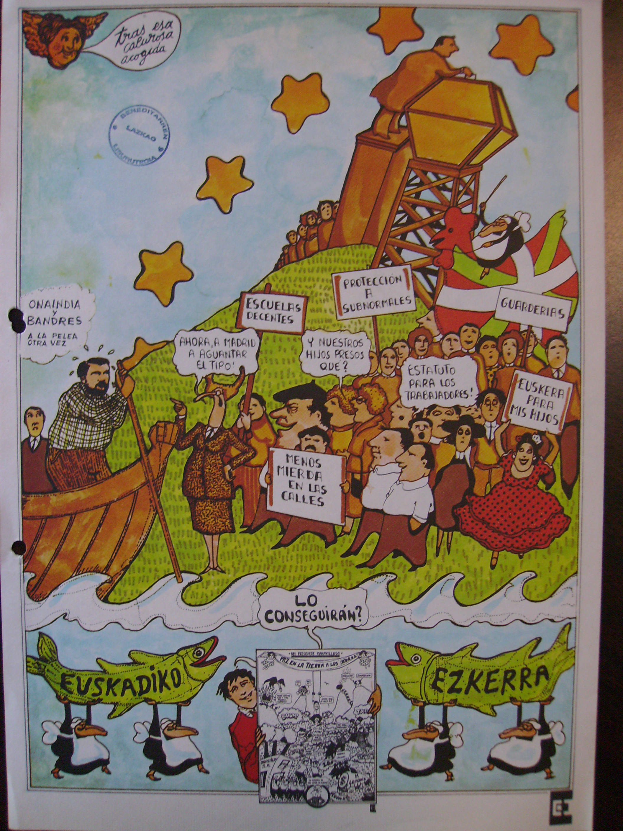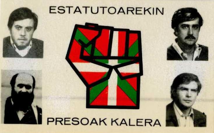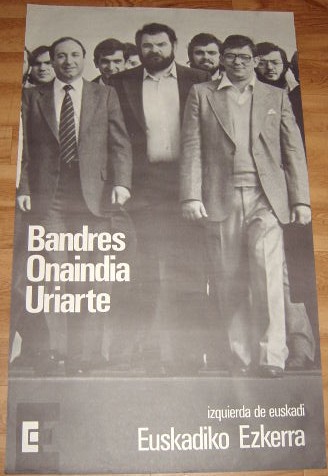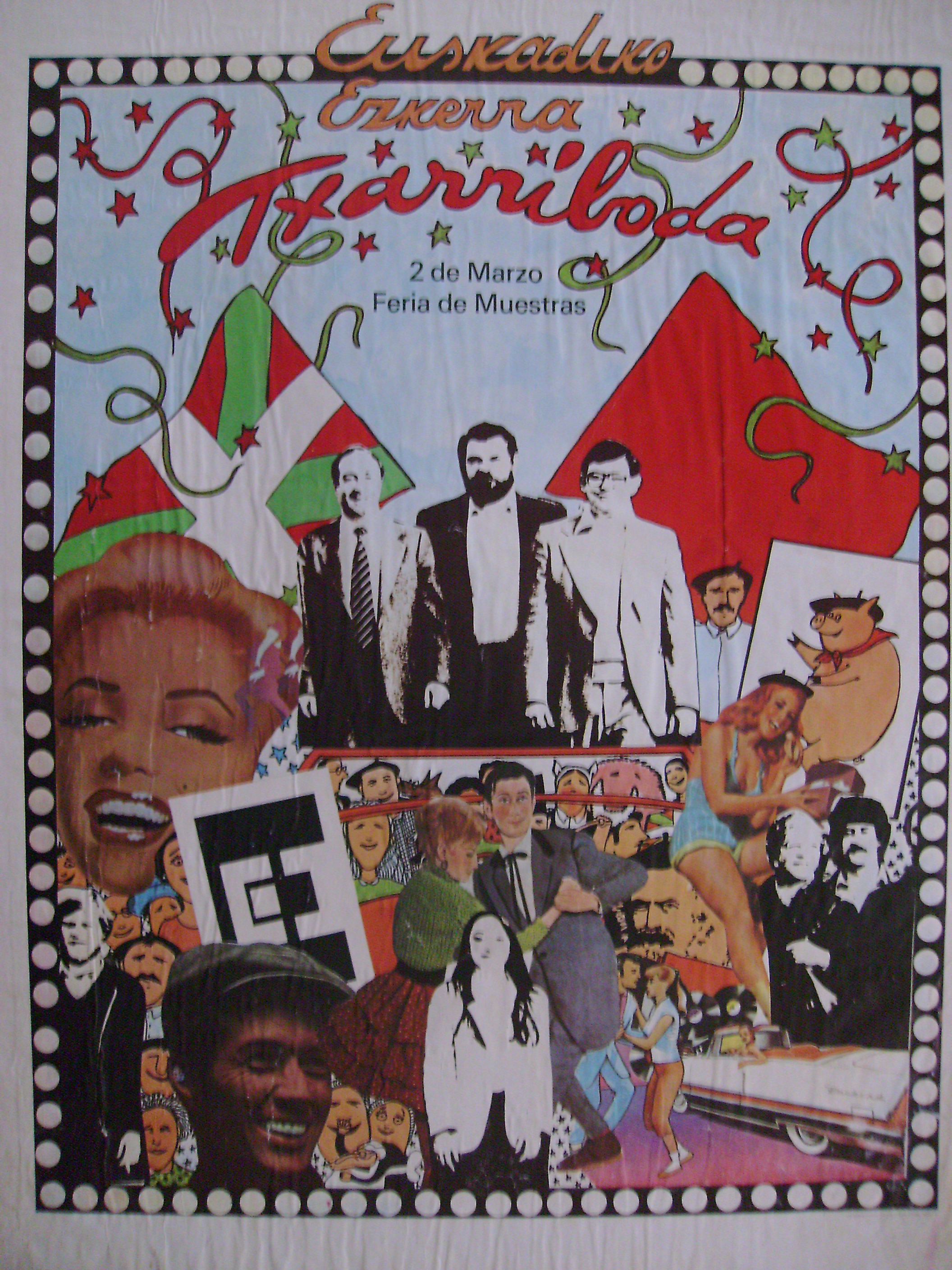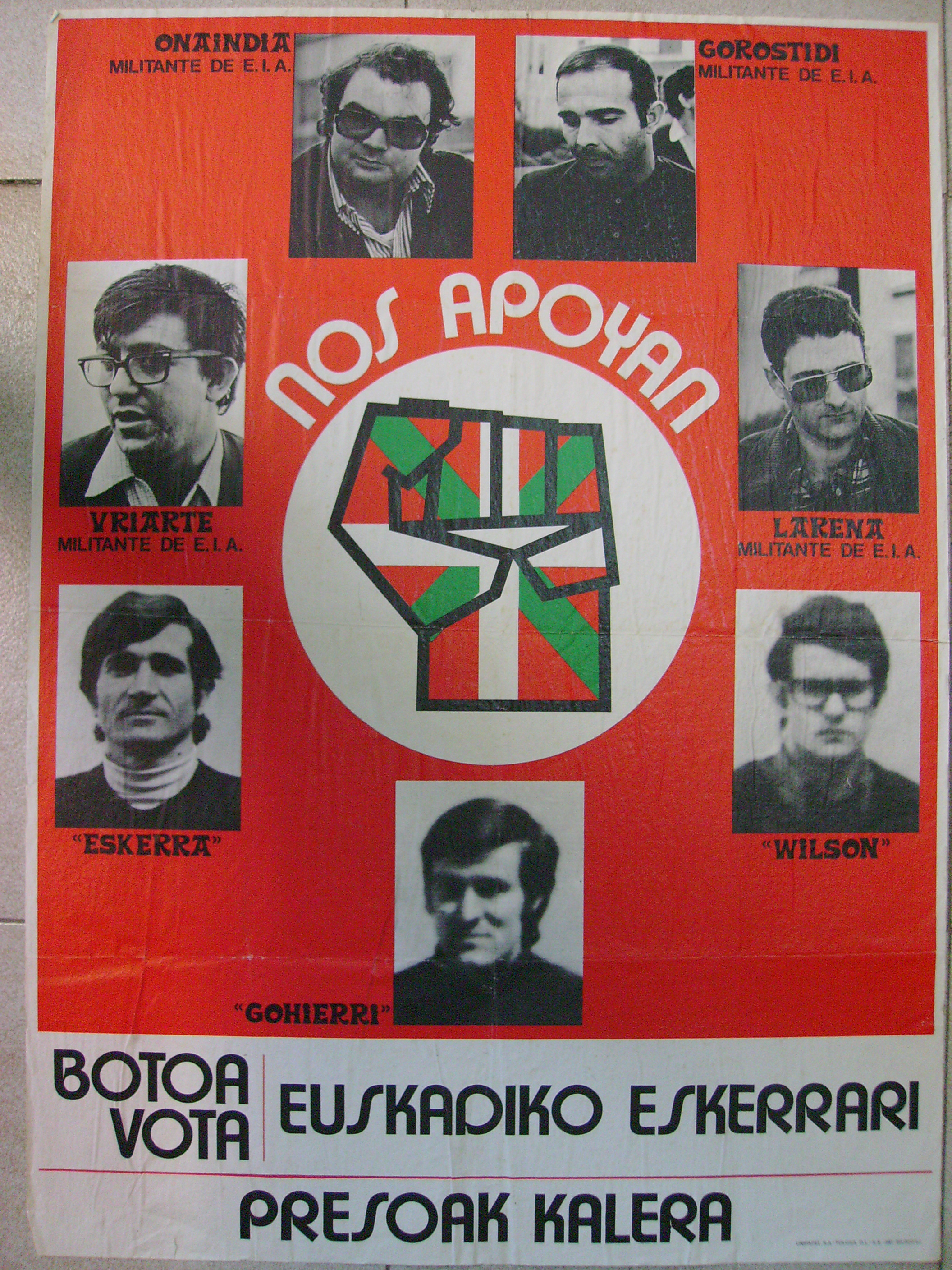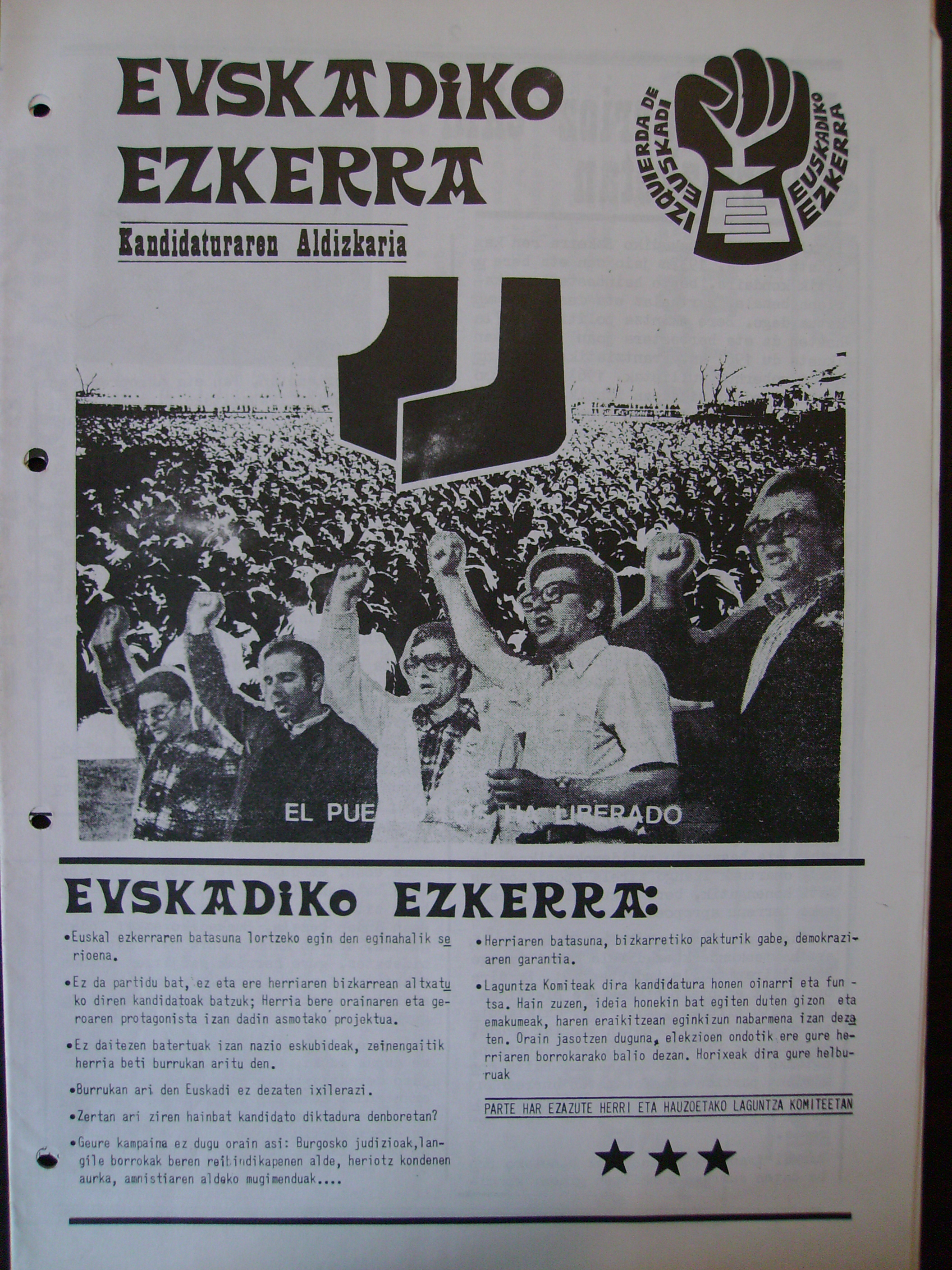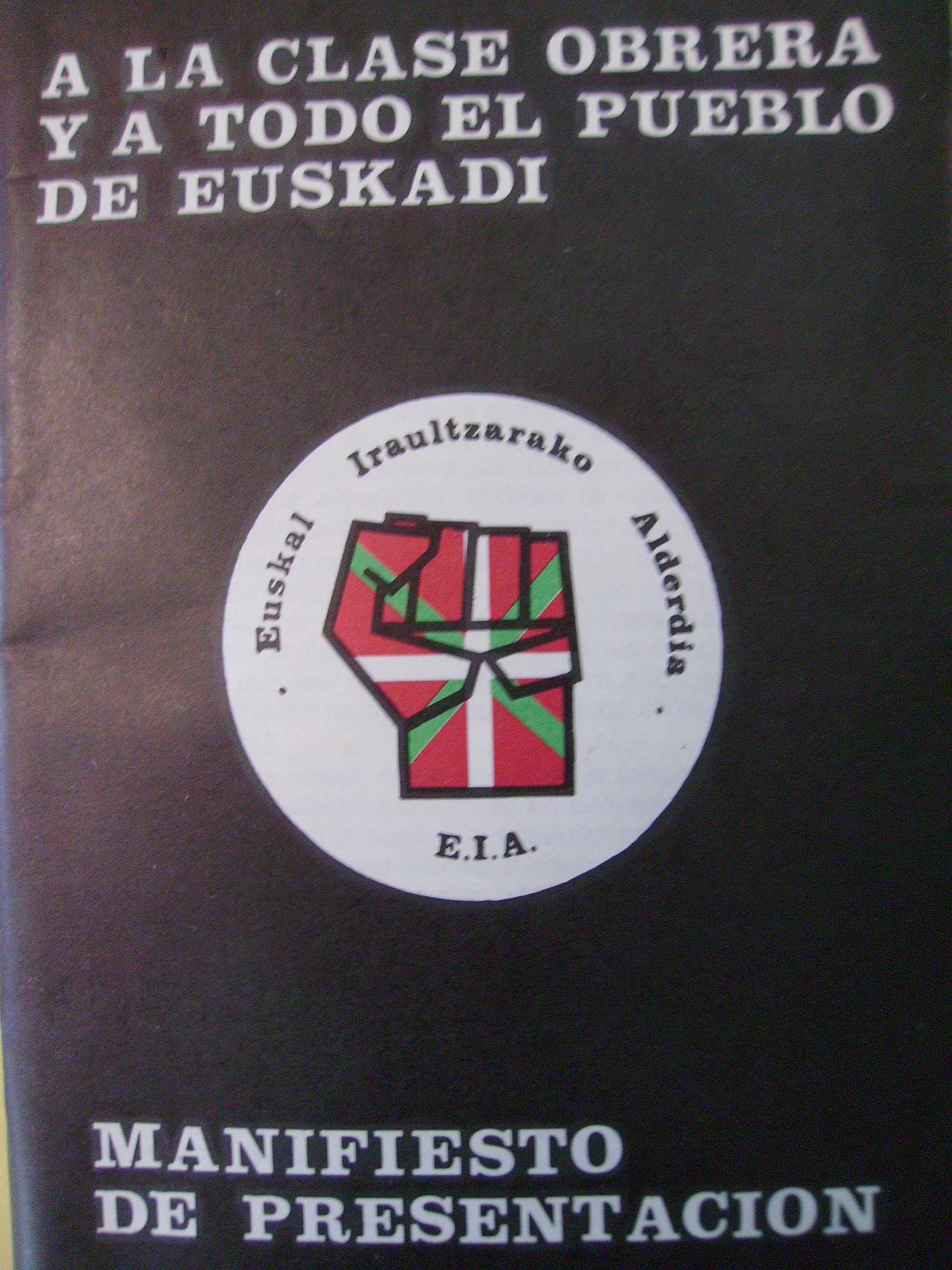 Como complemento a mi tesis doctoral, que será pronto publicada por la editorial Tecnos (Héroes, heterodoxos y traidores. Historia de Euskadiko Ezkerra), he decidido subir aquí algunas de las imágenes de pegatinas, carteles y pasquines de EIA y EE que he ido recopilando estos últimos años. Algunas de ellas las saqué en su momento de la web de la Fundación Sancho el Sabio (Vitoria), pero la mayoría son fotografías tomadas en el impresionante fondo de la Lazkaoko Beneditarren Fundazioa (Fundación de los Benedictinos de Lazcano, en Guipúzcoa). He procurado seguir el orden cronológico, pero no siempre ha sido posible, ya que hay imágenes que no soy capaz de ubicar en el tiempo. De cualquier manera, creo que son una buena muestra de lo que fueron y representaron EIA y EE, así como de su evidente evolución. En este post colgaré aquellas relacionadas directamente con la historia de EIA (1976-1982). En el siguiente las de EE.