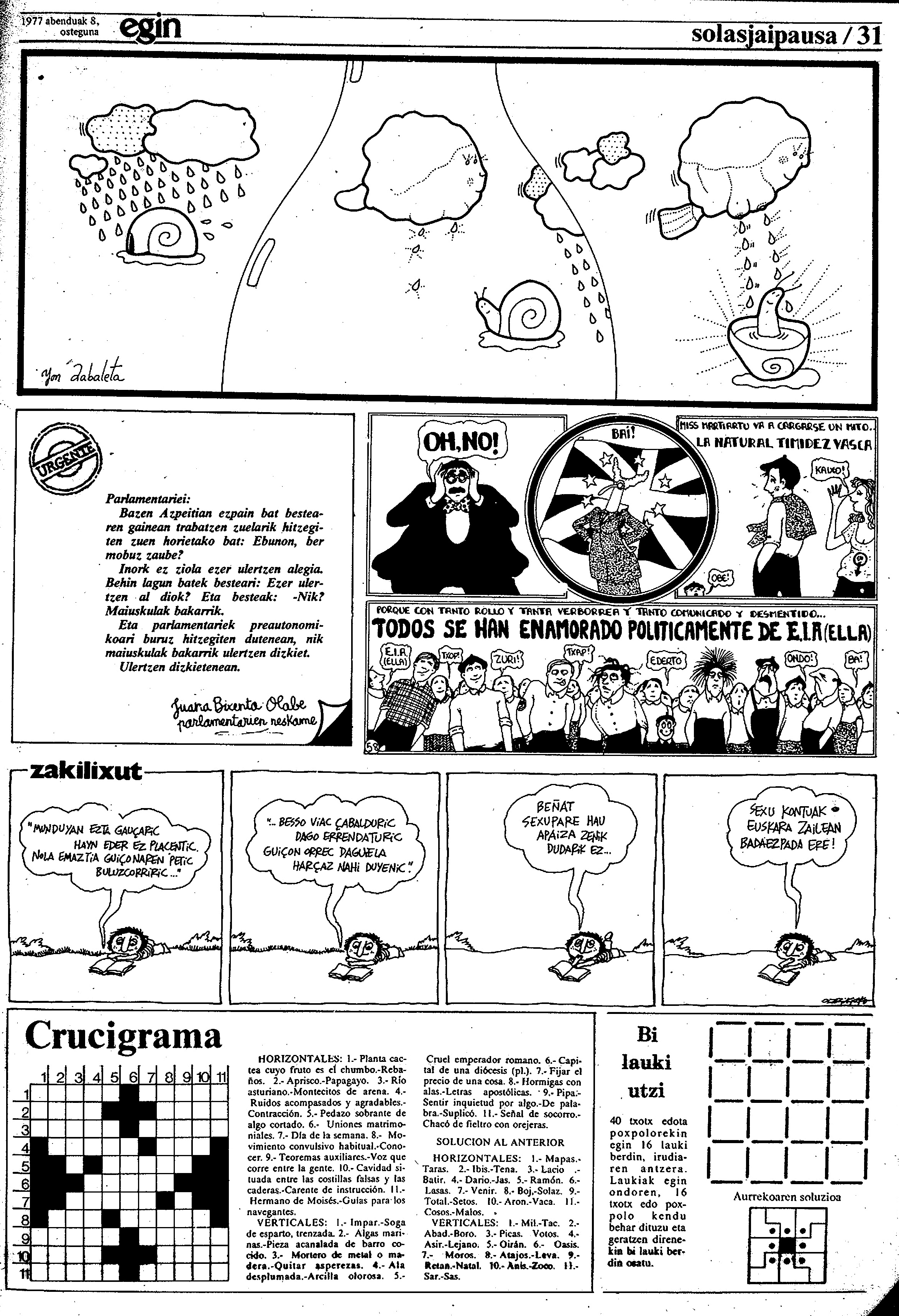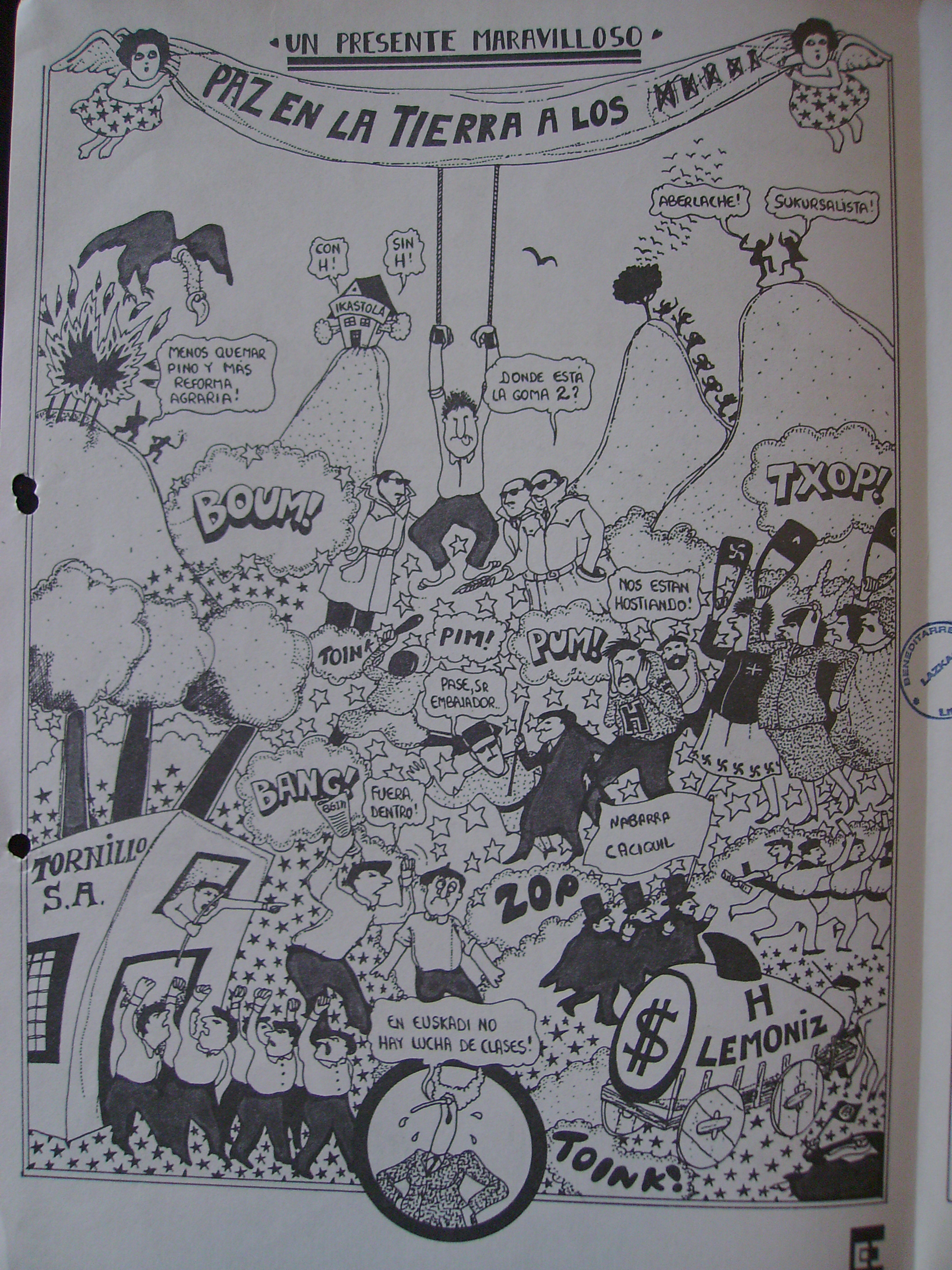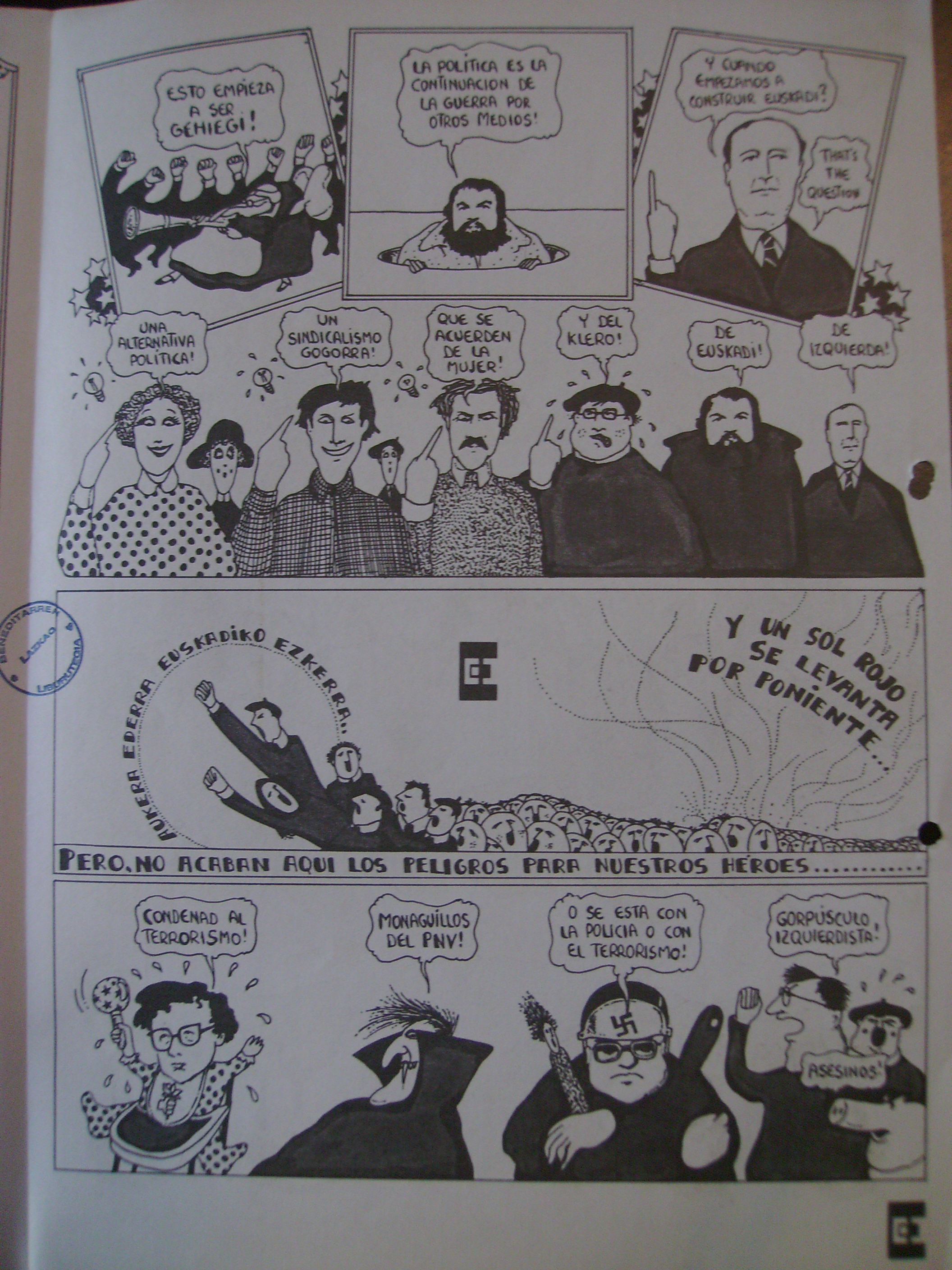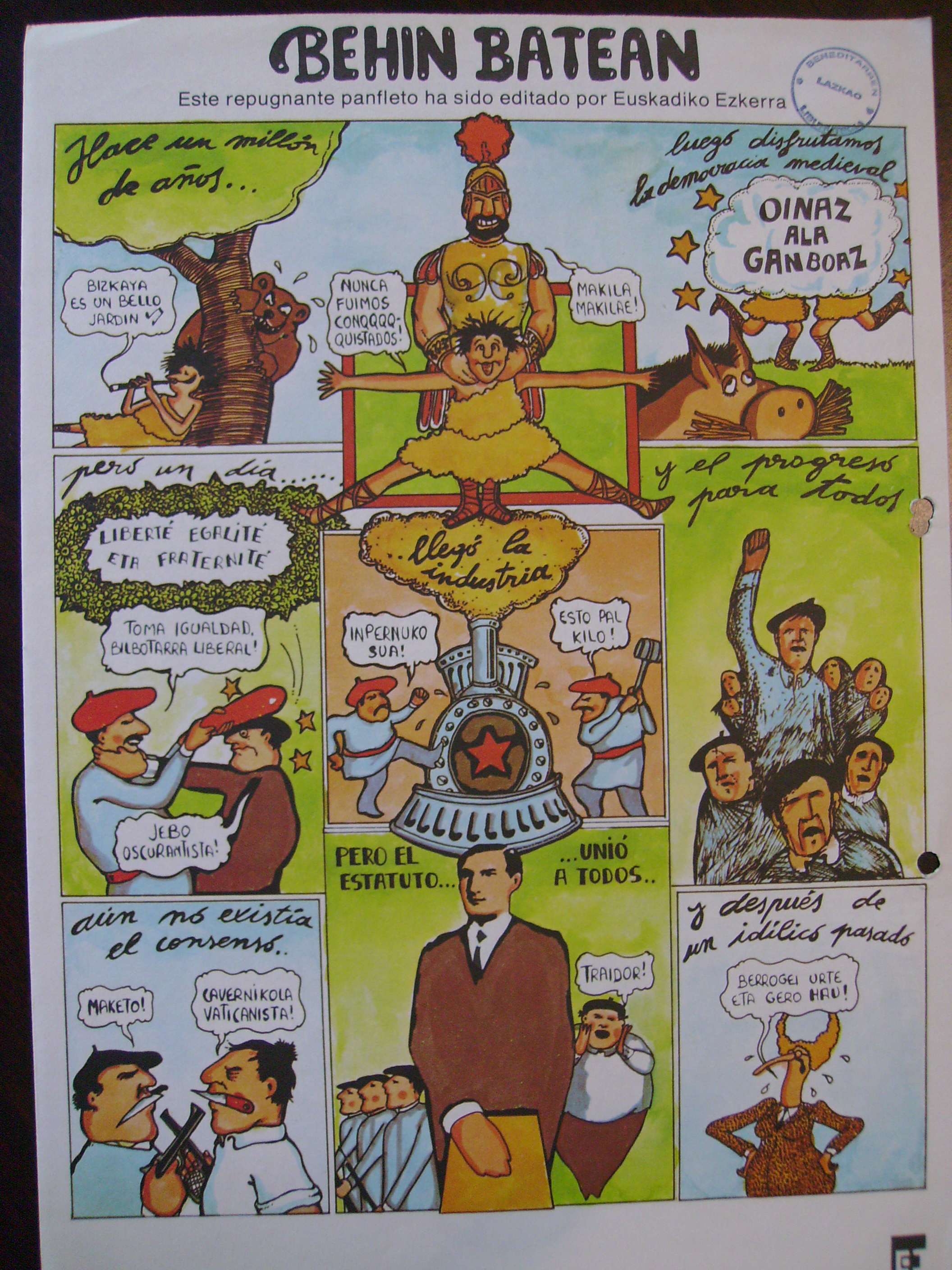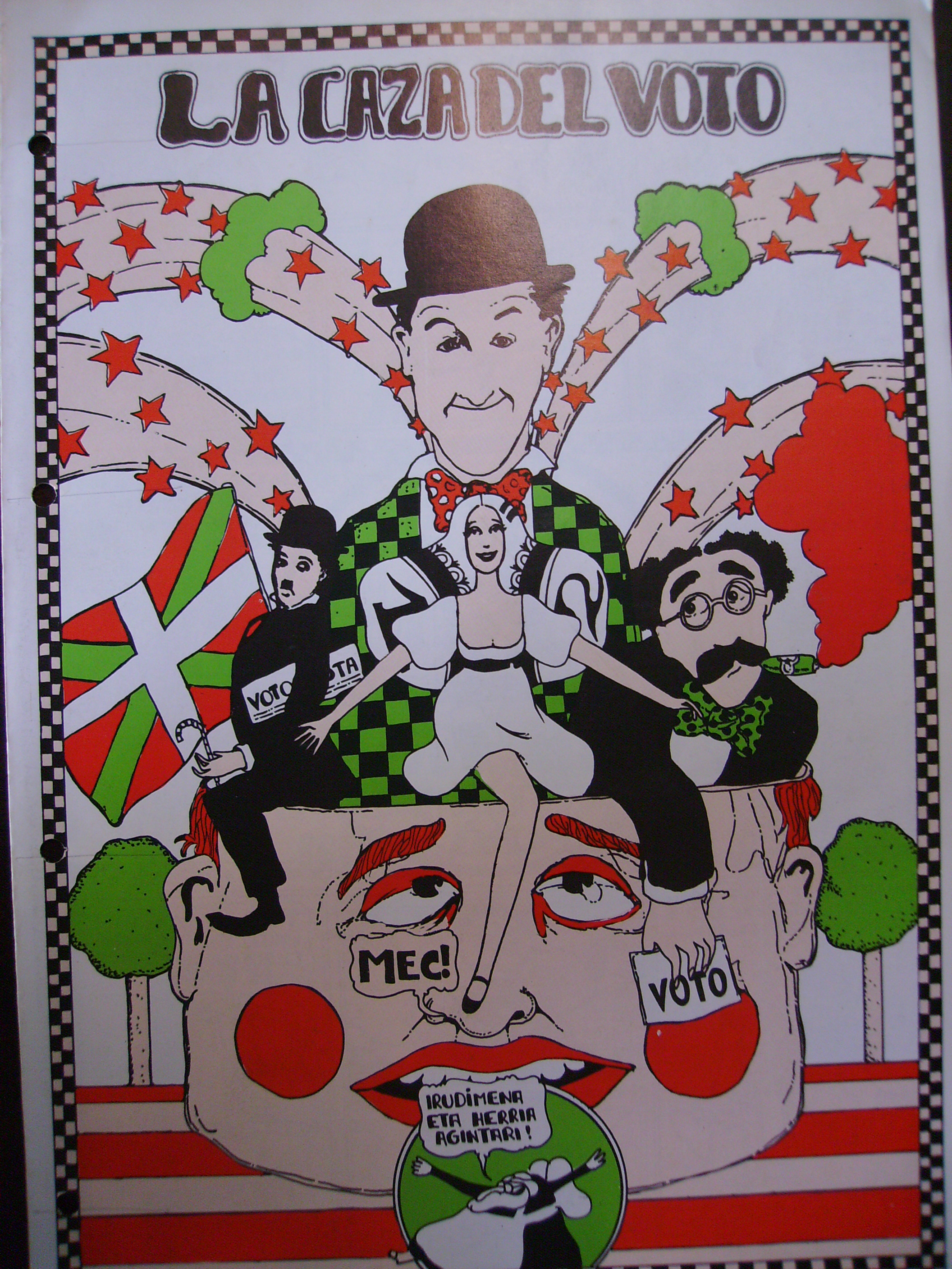 Como complemento a mi tesis doctoral, que será pronto publicada por la editorial Tecnos (Héroes, heterodoxos y traidores. Historia de Euskadiko Ezkerra), he decidido subir aquí algunas de las imágenes de pegatinas, carteles y pasquines de EIA y EE que he ido recopilando estos últimos años. Algunas de ellas las saqué en su momento de la web de la Fundación Sancho el Sabio (Vitoria), pero la mayoría son fotografías tomadas en el impresionante fondo de la Lazkaoko Beneditarren Fundazioa (Fundación de los Benedictinos de Lazcano, en Guipúzcoa). He procurado seguir el orden cronológico, pero no siempre ha sido posible, ya que hay imágenes que no soy capaz de ubicar en el tiempo. De cualquier manera, creo que son una buena muestra de lo que fueron y representaron EIA y EE, así como de su evidente evolución. En este post colgaré aquellas relacionadas directamente con la historia de EIA (1976-1982). En el siguiente las de EE.
