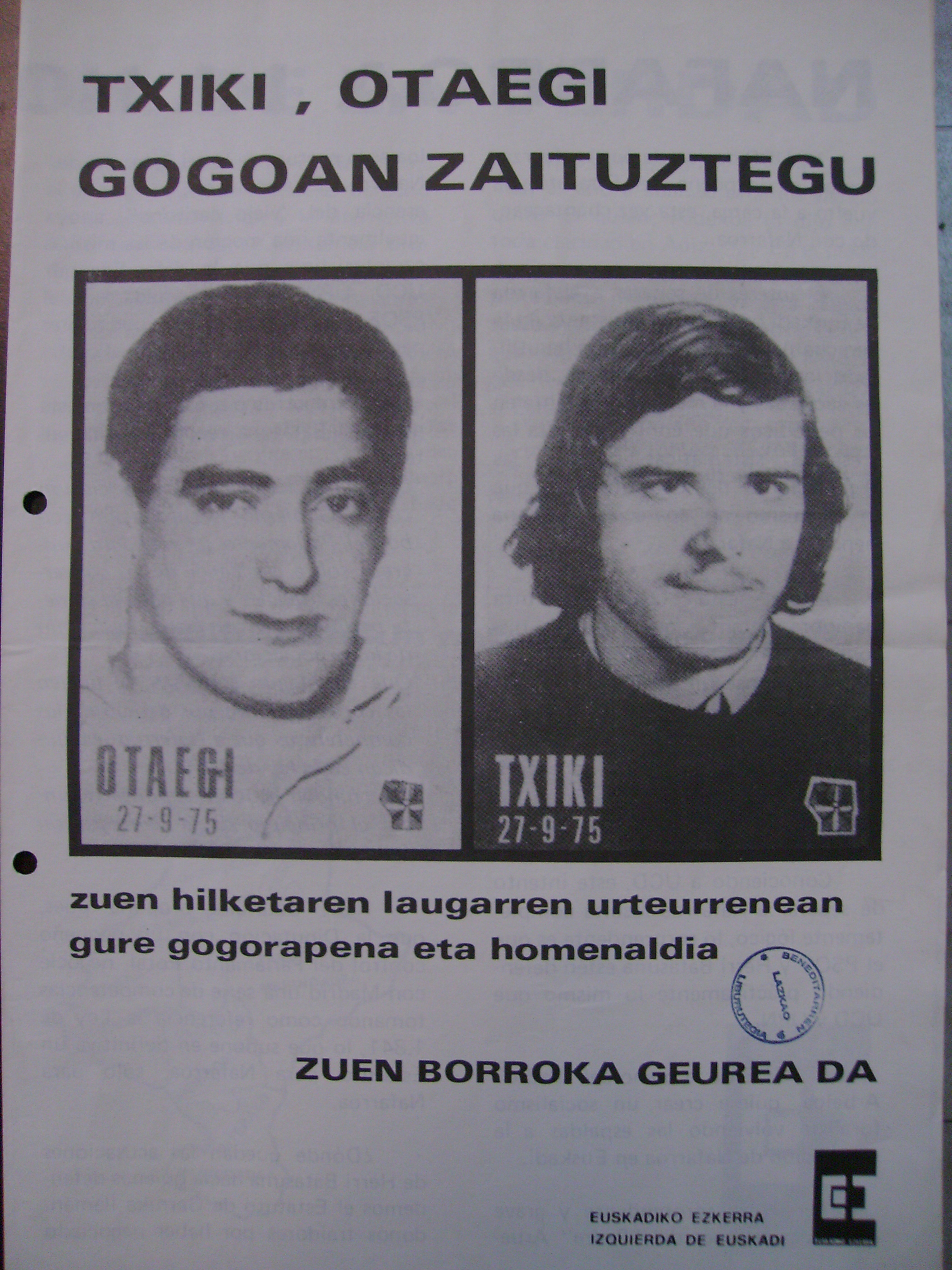 En el contexto de esta disputa de familia, ¿qué ocurrió con la efeméride de la ejecución de los dos mártires por antonomasia de ETApm y, por extensión, de la «izquierda abertzale»: Txiki y Otaegi? Ya en la huelga general de 1976 habían demostrado su valor como símbolo, precipitante de la movilización y simiente de nuevos gudaris. Por este motivo, su fusilamiento fue conmemorado ritualmente cada 27 de septiembre. Durante algunos años, al igual que los polimilis habían hecho en 1976, EIA tomó parte en las convocatorias conjuntas que organizaban el nacionalismo radical y parte de la extrema izquierda. Las concentraciones de 1978, no obstante, fueron descaradamente instrumentalizadas por la facción maximalista de la «izquierda abertzale». Habían sido prohibidas por los cuatro Gobiernos civiles del País Vasco y Navarra, a pesar de lo cual fueron toleradas en ciertos lugares. Uno de ellos fue Bilbao, donde, sin mediar provocación alguna y antes de dar comienzo el acto, un grupo de simpatizantes de HB cruzó autobuses en la calle y lanzó cocteles molotov contra la policía al grito de «ETA, mátalos». EIA, atrapada en tierra de nadie, entre la gasolina y las porras, no tuvo más remedio que retirarse dejando el campo libre a los alborotadores.