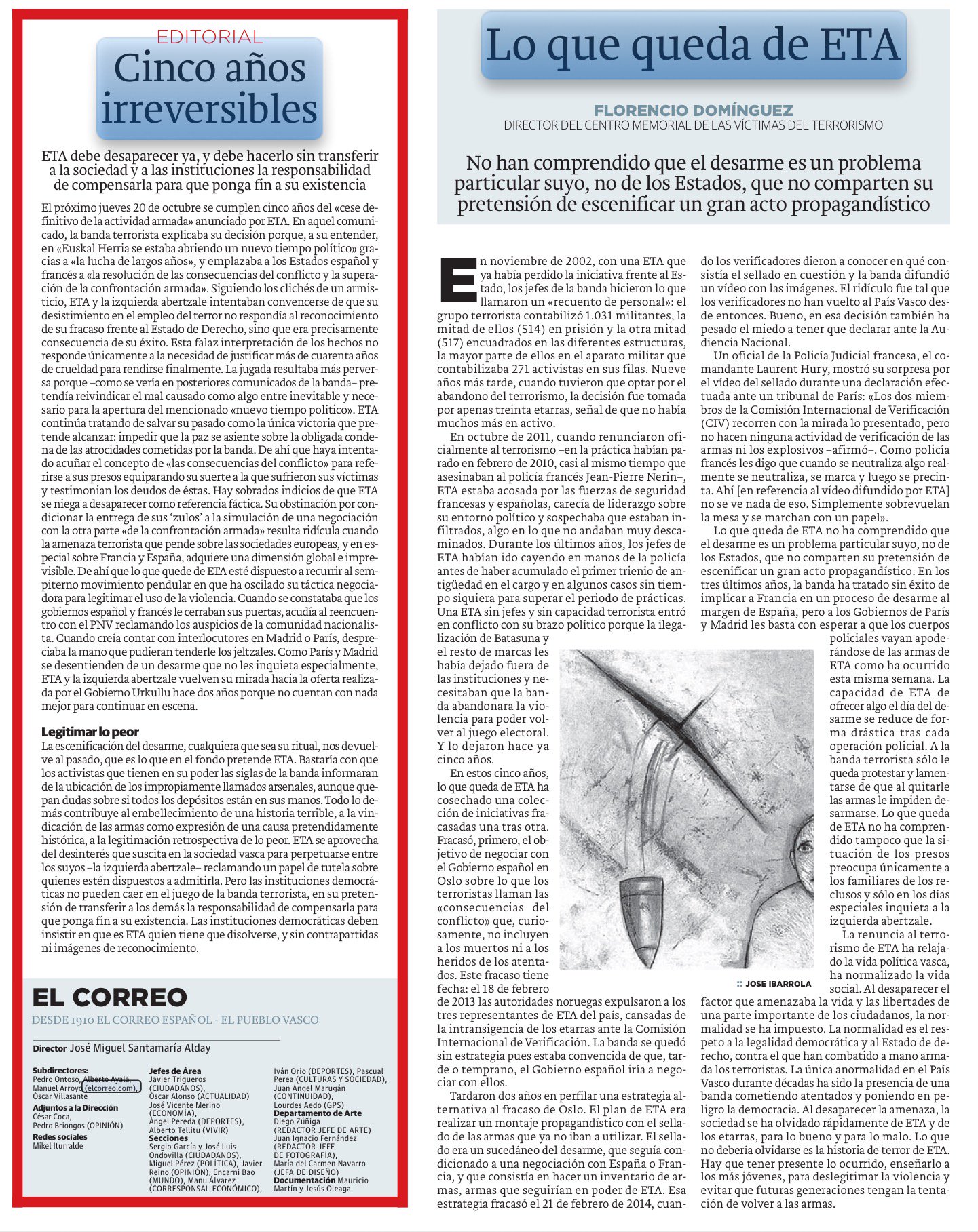 En octubre de 2011, cuando renunciaron oficialmente al terrorismo –en la práctica habían parado en febrero de 2010, casi al mismo tiempo que asesinaban al policía francés Jean-Pierre Nerin–, ETA estaba acosada por las fuerzas de seguridad francesas y españolas, carecía de liderazgo sobre su entorno político y sospechaba que estaban infiltrados, algo en lo que no andaban muy descaminados. Durante los últimos años, los jefes de ETA habían ido cayendo en manos de la policía antes de haber acumulado el primer trienio de antigüedad en el cargo y en algunos casos sin tiempo siquiera para superar el periodo de prácticas. Una ETA sin jefes y sin capacidad terrorista entró en conflicto con su brazo político porque la ilegalización de Batasuna y el resto de marcas les había dejado fuera de las instituciones y necesitaban que la banda abandonara la violencia para poder volver al juego electoral. Y lo dejaron hace ya cinco años.