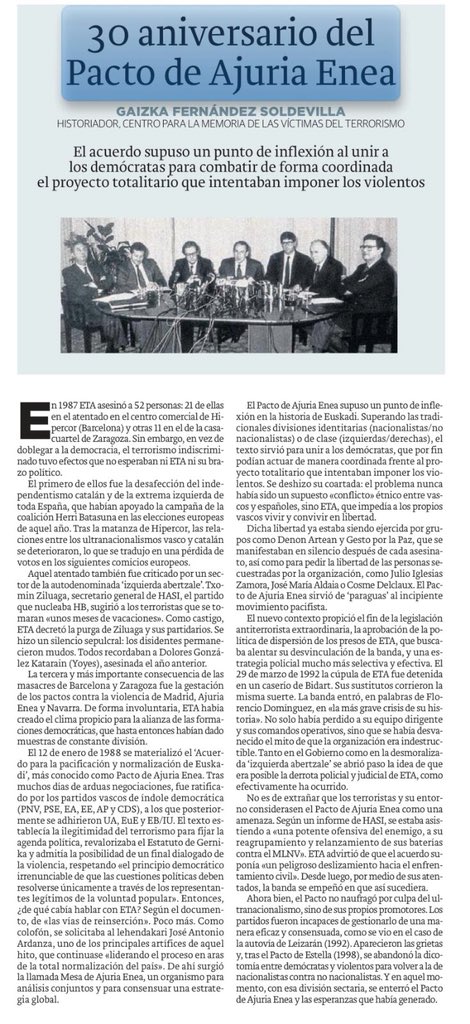 Gracias, Gaizka, por el recuerdo.Pienso que el Pacto de Ajuria Enea, en 1988, fue muy eficaz en su década. Y la Sentencia de Estrasburgo, en la suya. Confío en que estarás atento para recordárnoslo en su aniversario.¡Labor de historiador!Saludos desde el Sur. Xabier Markiegi Candina