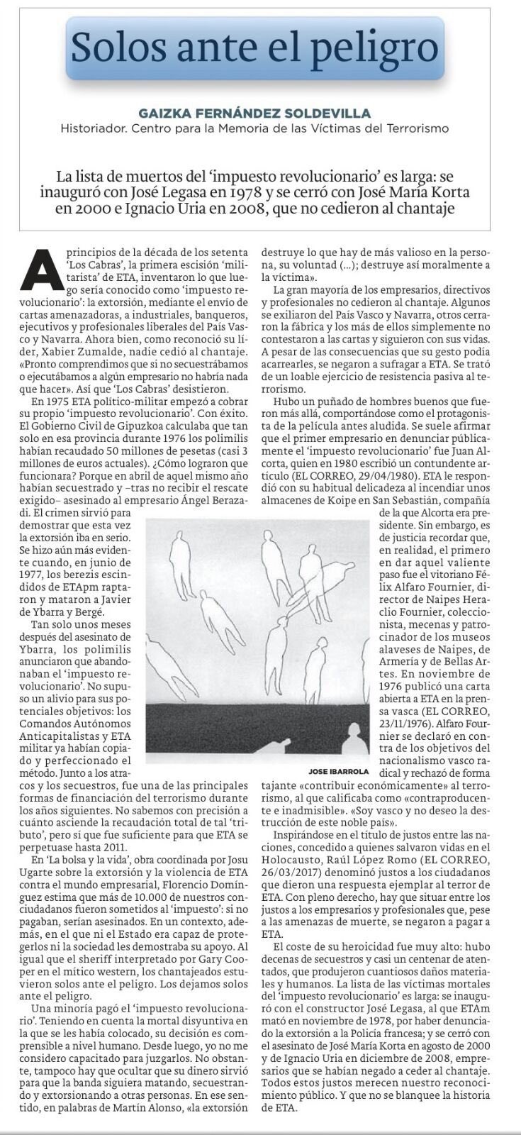 El coste de su heroicidad fue muy alto: hubo decenas de secuestros y casi un centenar de atentados, que produjeron cuantiosos daños materiales y humanos. La lista de las víctimas mortales del “impuesto revolucionario” es larga: se inauguró con el constructor José Legasa, al que ETAm mató en noviembre de 1978, por haber denunciado la extorsión a la Policía francesa; y se cerró con el asesinato de José María Korta en agosto de 2000 y de Ignacio Uria en diciembre de 2008, empresarios que se habían negado a ceder al chantaje. Todos estos justos merecen nuestro reconocimiento público. Y que no se blanquee la historia de ETA.