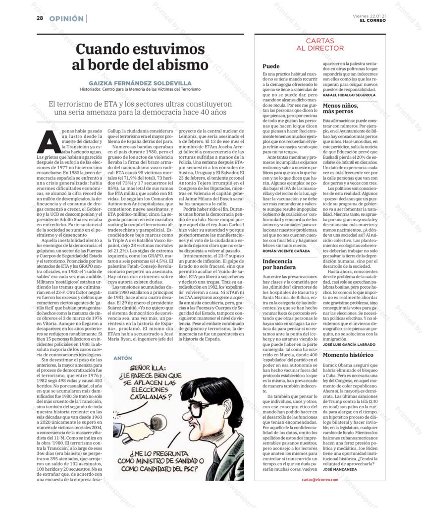 Las tensiones acumuladas durante 1980 estallaron a principios de 1981, hace ahora cuatro décadas. El 29 de enero el presidente Suárez dimitió: “Yo no quiero que el sistema democrático de convivencia sea, una vez más, un paréntesis en la Historia de España”. El mismo día ETAm había secuestrado a José María Ryan, el ingeniero jefe del proyecto de la central de Lemóniz, que sería asesinado el 6 de febrero. El 13 de ese mes el miembro de ETAm Joseba Arregi falleció a consecuencia de las torturas sufridas a manos de la Policía. Una semana después ETApm secuestró a los cónsules de Austria, Uruguay y El Salvador. El 23 de febrero el teniente coronel Antonio Tejero irrumpió en el Congreso de los diputados mientras que en Valencia el capitán general Jaime Milans del Bosch sacaba los tanques a la calle.