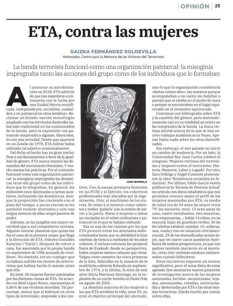 Contamos con bibliografía sobre ETA y la cuestión del género, pero sintomáticamente casi en su totalidad se centra en las integrantes de la banda. La única víctima mortal acerca de la que se han escrito trabajos académicos es Yoyes. Apenas había nada sobre las otras damnificadas.