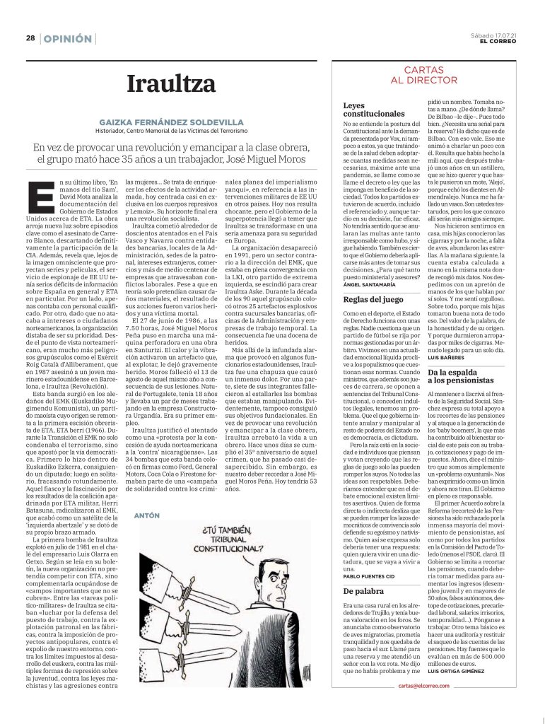 Más allá de la infundada alarma que provocó en algunos funcionarios estadounidenses, Iraultza fue una chapuza que causó un inmenso dolor. Por una parte, siete de sus integrantes fallecieron al estallarles las bombas que estaban manipulando. Evidentemente, tampoco consiguió sus objetivos fundacionales. En vez de provocar una revolución y emancipar a la clase obrera, Iraultza arrebató la vida a un obrero. Hace unos días se cumplió el 35º aniversario de aquel crimen, que ha pasado casi desapercibido. Sin embargo, es nuestro deber recordar a José Miguel Moros Peña. Hoy tendría 53 años.