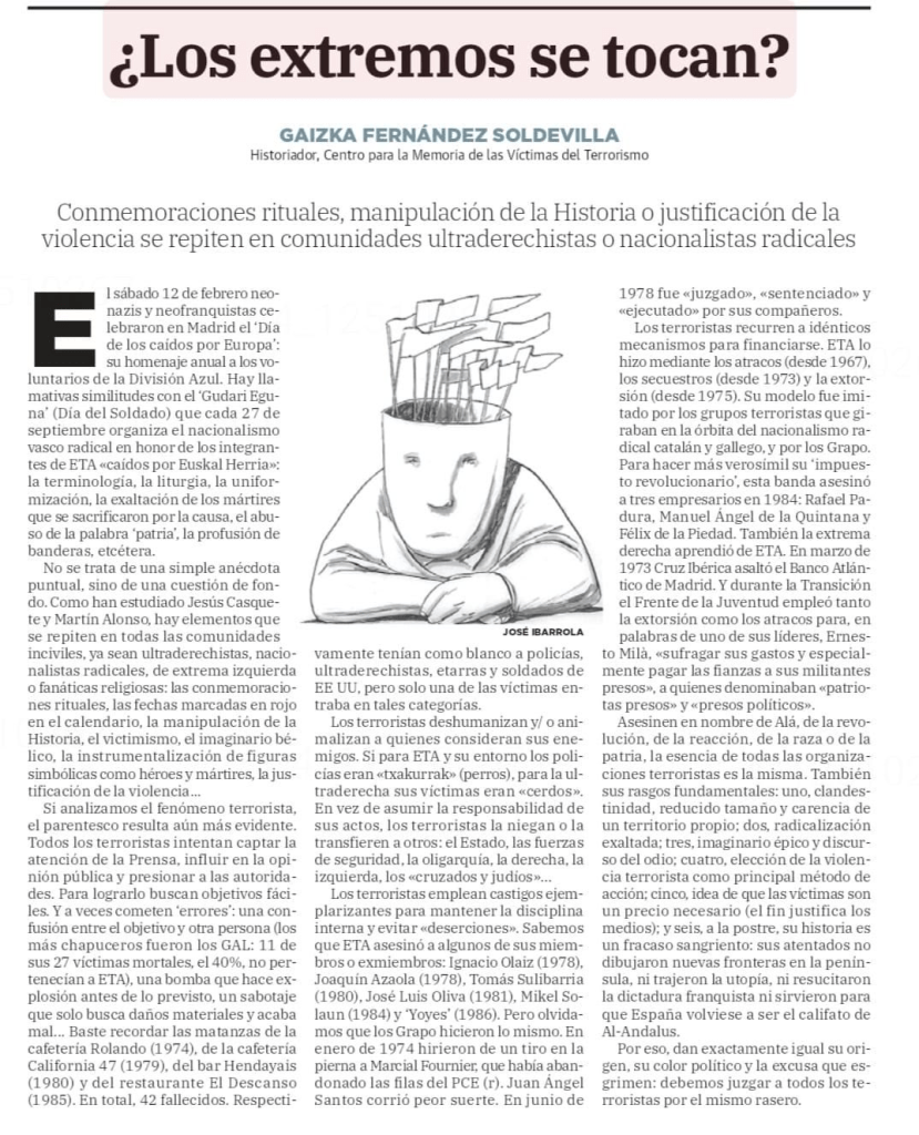 El sábado 12 de febrero neonazis y neofranquistas han celebrado en Madrid el “Día de los caídos por Europa”: su homenaje anual a los voluntarios de la División Azul. Hay llamativas similitudes con el “Gudari Eguna” (Día del Soldado) que cada 27 de septiembre organiza el nacionalismo vasco radical en honor de los integrantes de ETA “caídos por Euskal Herria”: la terminología, la liturgia, la uniformización, la exaltación de los mártires que se sacrificaron por la causa, el abuso de la palabra “patria”, la profusión de banderas, etc.