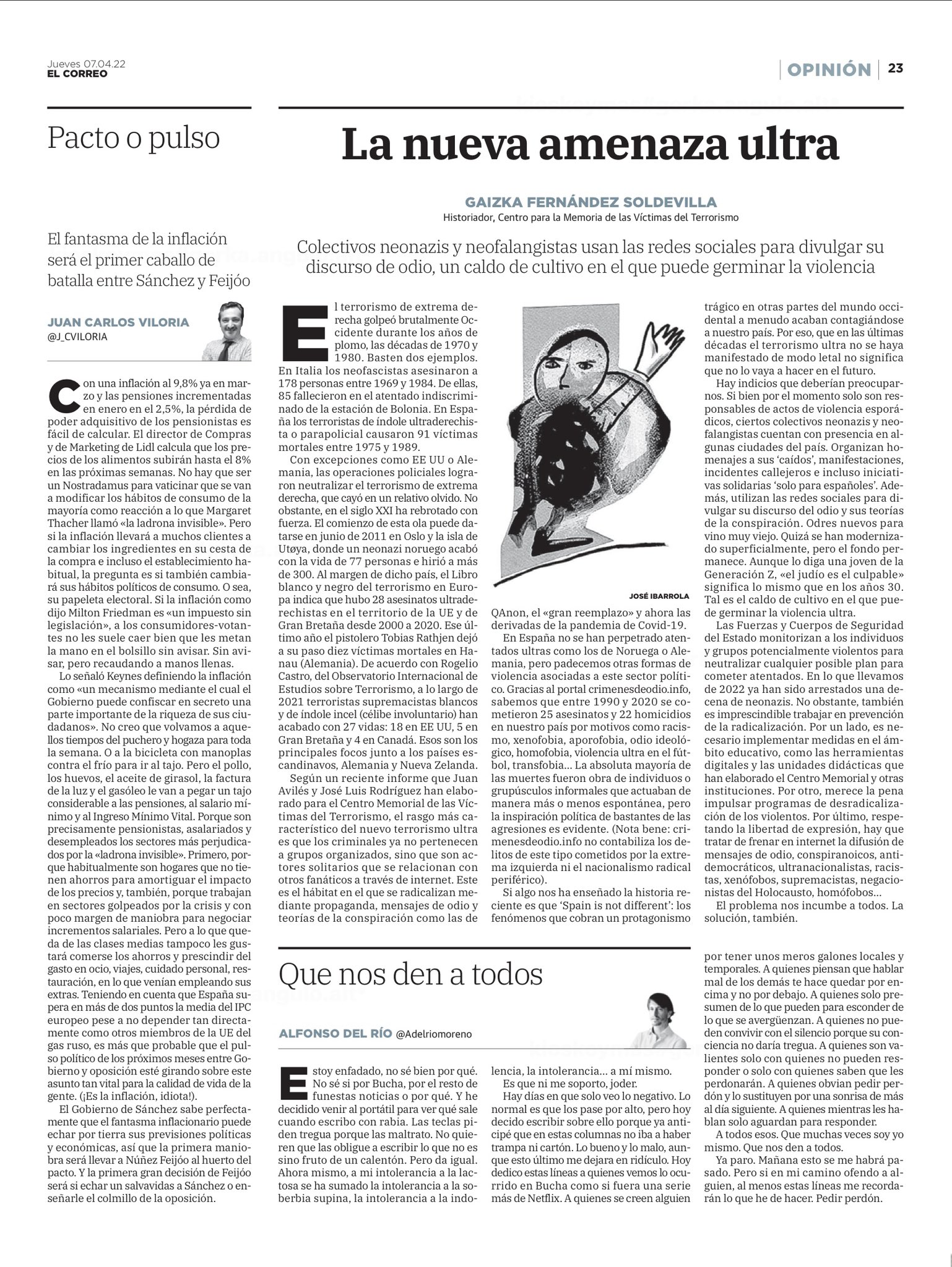 Según un reciente informe que Juan Avilés y José Luis Rodríguez han elaborado para el Centro Memorial de las Víctimas del Terrorismo, el rasgo más característico del nuevo terrorismo ultra es que los criminales ya no pertenecen a grupos organizados, sino que son actores solitarios que se relacionan con otros fanáticos a través de internet. Este es el hábitat en el que se radicalizan mediante propaganda, mensajes de odio y teorías de la conspiración como las de QAnon, el “gran reemplazo” y ahora las derivadas de la pandemia de COVID-19.