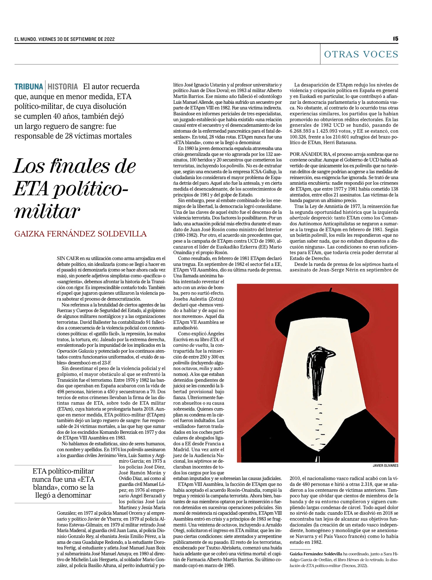 No hablamos de estadísticas, sino de seres humanos, con nombre y apellidos. En 1974 los polimilis asesinaron a los guardias civiles Jerónimo Vera, Luis Santos y Argimiro García; en 1975 a los policías José Díez, José Ramón Morán y Ovidio Díaz, así como al guardia civil Manuel López; en 1976 al empresario Ángel Berazadi y los policías José Luis Martínez y Jesús María González; en 1977 al policía Manuel Orcera y al empresario y político Javier de Ybarra; en 1979 al policía Alfonso Estevas-Gilmain; en 1979 al militar retirado José María Maderal, al guardia civil Juan Luna, al policía Dionisio Gonzalo Rey, al ebanista Jesús Emilio Pérez, a la ama de casa Guadalupe Redondo, a la estudiante Dorotea Fertig, al estudiante y atleta José Manuel Juan Boix y al submarinista José Manuel Amaya; en 1980 al directivo de Michelín Luis Hergueta, al soldador Mario González, al policía Basilio Altuna, al perito industrial y político José Ignacio Ustarán y al profesor universitario y político Juan de Dios Doval; en 1983 al militar Alberto Martín Barrios. Ese mismo año falleció el odontólogo Luis Manuel Allende, que había sufrido un secuestro por parte de ETApm VIII en 1982. Se trató de una víctima indirecta. Basándose en los informes periciales de tres especialistas, un juzgado estableció que había existido «una relación causal entre el secuestro y el desencadenamiento de los síntomas de la enfermedad pancreática para el fatal desenlace». En total, 28 vidas rotas. ETApm nunca fue una «ETA blanda», como se la llegó a denominar.