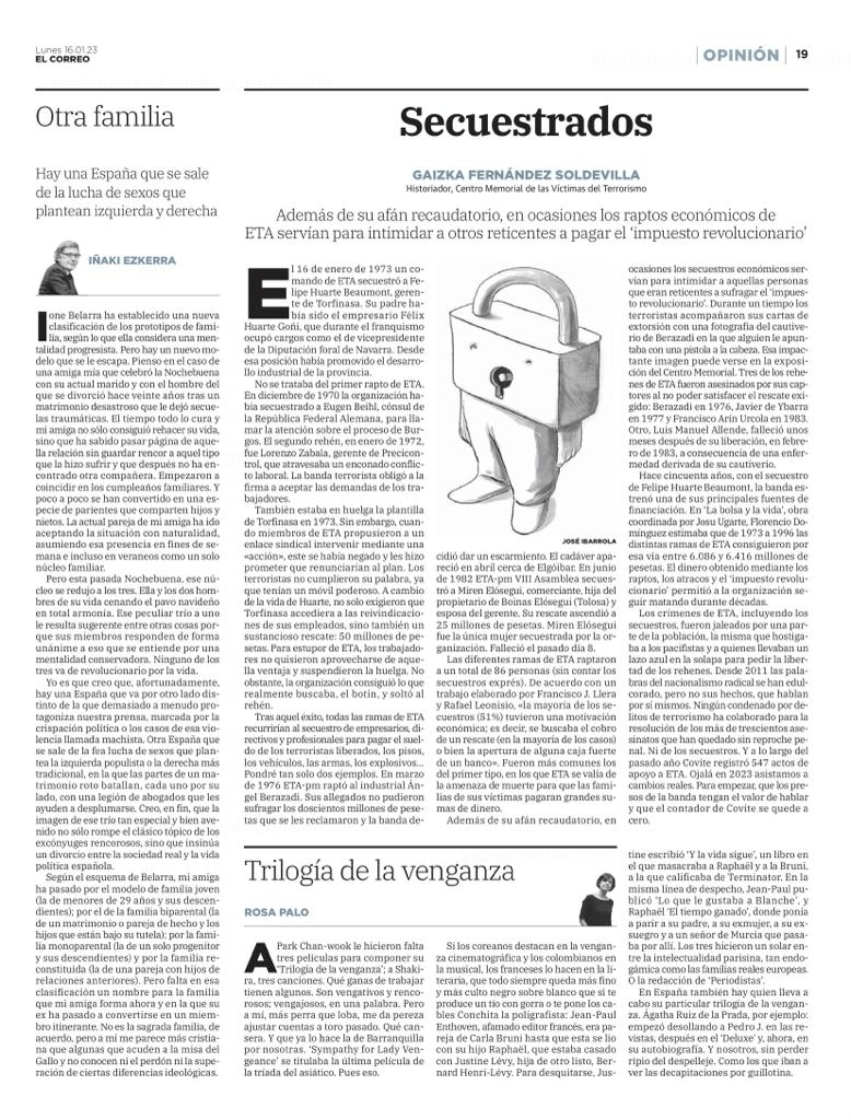 Tras aquel éxito, todas las ramas de ETA recurrirían al secuestro de empresarios, directivos y profesionales para pagar el sueldo de los terroristas liberados, los pisos, los vehículos, las armas, los explosivos… Pondré tan solo dos ejemplos. En marzo de 1976 ETApm raptó al industrial Ángel Berazadi. Sus allegados no pudieron sufragar los doscientos millones de pesetas que se les reclamaron y la banda decidió dar un escarmiento. El cadáver apareció en abril cerca de Elgóibar. En junio de 1982 ETApm VIII Asamblea secuestró a Miren Elósegui, comerciante, hija del propietario de Boinas Elósegui (Tolosa) y esposa del gerente. Su rescate ascendió a 25 millones de pesetas. Miren Elósegui fue la única mujer secuestrada por la organización. Falleció hace unos días, el 8 de enero.
