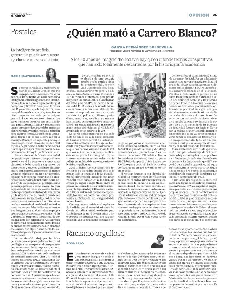 El 20 de diciembre de 1973 la explosión de una potente bomba acabó con las vidas del presidente del Gobierno, Luis Carrero Blanco, de su chófer, José Luis Pérez Mogena, y de su escolta, Juan Antonio Bueno Fernández. ETA reivindicó el atentado, pero pronto surgieron las dudas. Junto a la actividad del FRAP y los GRAPO, así como a la masacre del 11-M, se trata de una de las acciones terroristas que más relatos fantasiosos ha inspirado en nuestra historia reciente. Así, políticos, militares, periodistas, ensayistas, novelistas y cineastas han lanzado conjeturas sobre la participación en el magnicidio de la masonería, algún sector del régimen, el KGB, la CIA o varios de estos actores a la vez.