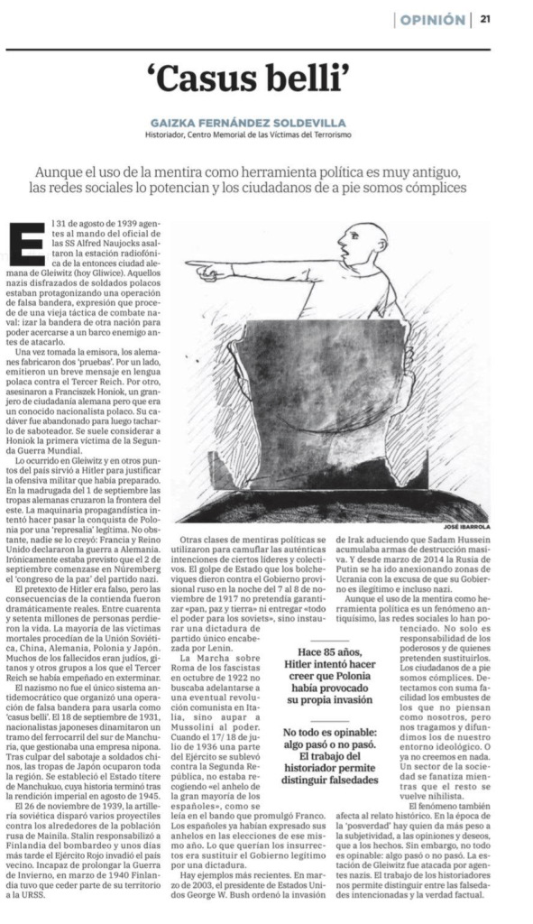 El fenómeno también afecta al relato histórico. En la época de la “posverdad” hay quien da más peso a la subjetividad, a las opiniones y deseos, que a los hechos. Sin embargo, no todo es opinable: algo pasó o no pasó. La estación de Gleiwitz fue atacada por agentes nazis. El trabajo de los historiadores nos permite distinguir entre las falsedades intencionadas y la verdad factual.