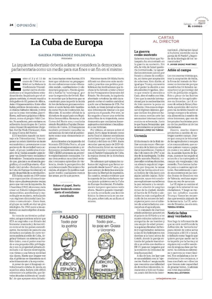 No sabemos qué opinan los cubanos del régimen que llevan soportando desde hace 67 años, porque carecen de derechos esenciales como la libertad de expresión. En cambio, resulta evidente que la mayoría de los ciudadanos vascos jamás quisieron ser la Cuba de Europa Occidental. Probablemente tampoco queramos serlo ahora. Nuestro pasado traumático nos ha enseñado una lección básica: la democracia es un medio, pero, sobre todo, es un fin en sí mismo.