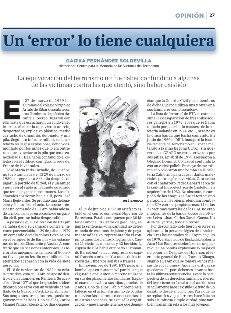 Por descontado, solo fueron “errores” si aplicamos la perversa lógica de la violencia. Tras los atentados de ETApm en julio de 1979, el diputado de EE Juan Mari Bandrés declaró: “si no se quiere que una bomba explosione lo mejor es no ponerla”. Después de Hipercor, el secretario general de HASI, Txomin Ziluaga, sugirió a ETAm que se tomara “unos meses de vacaciones”. Aquellas críticas se quedaron allí, pero debemos llevarlas hasta las últimas consecuencias. Desde la perspectiva de los derechos humanos, el error del terrorismo no fue tal o cual acción, sino sencillamente haber existido. Se trató de un desatino desde el principio. Para que no se repitan los viejos “errores” hace falta no solo asumir esa simple verdad, sino también transmitírsela a los más jóvenes.